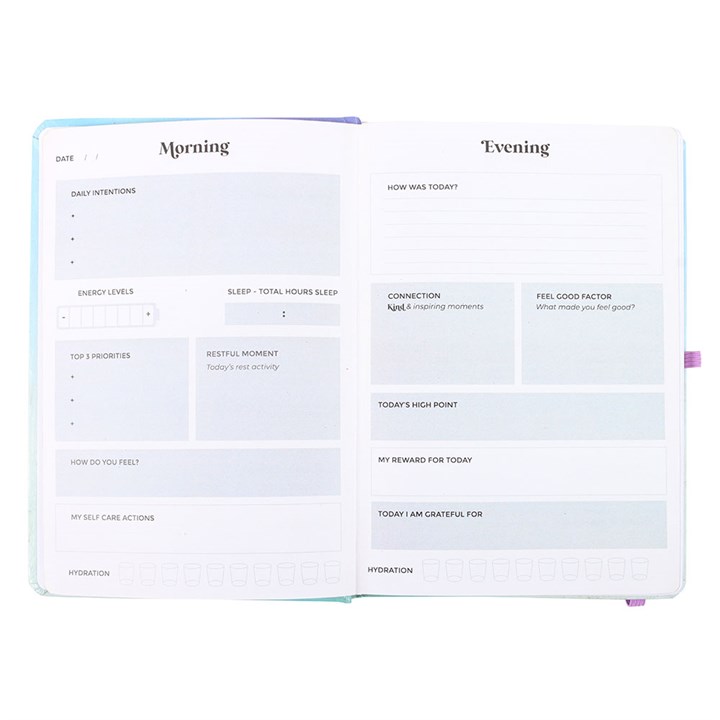 Stay on track with your thoughts, goals, and reflections using this A5 wellness journal with prompted pages, featuring calming artwork and an elastic closure to keep everything in place. Includes a coordinating crystal chip pen for jotting down daily intentions or moments of mindfulness. 100 iridescent-edged sheets / 200 prompted pages.