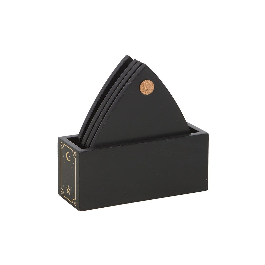 Bring some conversation to the table with this set of 4 black and gold coasters featuring a celestial talking board design. Shaped like planchettes, the coasters come with a matching holder for neat and easy storage. Wipe clean with a damp cloth.